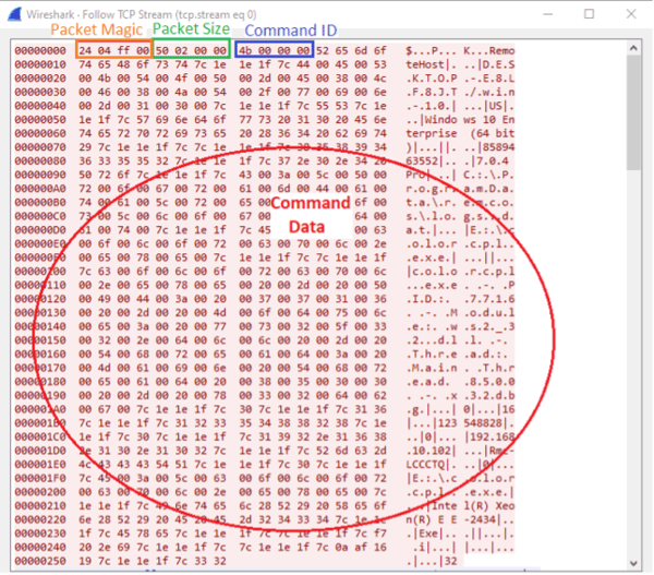 このパケットは、パケットマジック値 0xff0424, で始まり、その後にパケットサイズ 0x250、コマンドID 0x4b, an、およびコマンドデータ(TLSが有効になっている場合は暗号化される)が続きます。