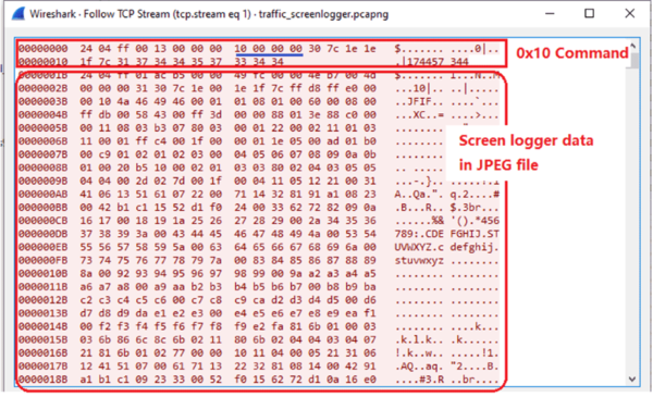 図18は、スクリーンロギングパケットの一例です。C2サーバーが送信したコマンド0x10 を受けて、Remcosエージェントが被害者の画面をキャプチャしてJPEGファイルに保存し、その画像ファイルをC2サーバーに送り返しています。