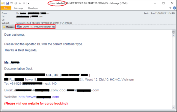 図2の捕捉されたフィッシングメールは、ベトナムの海運会社からのメッセージを装っており、添付のWordファイルを開いて更新された配送書類を確認するよう受信者に促しています。