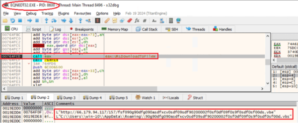 シェルコードの主な機能は、復号されたURLからVBScriptファイルをダウンロードすることです。図6では、EQNEDT32.EXEプロセス内で実行されるシェルコードが URLDownloadToFileW() を呼び出してVBScriptファイルをダウンロードしようとしています。図6の下部では、復号されたURLである