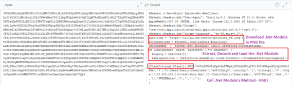 PowerShellコードは、変換されて通常の画像ファイル(実際にJPEGデータが格納されているoptimized_MSI.png)に埋め込まれた.NETモジュール(.NET DLL)をダウンロードします。Base64エンコードされた.NETモジュールはこのようにPNGファイルに付加されて、マーカー BaseStart-と-BaseEndで囲まれます。