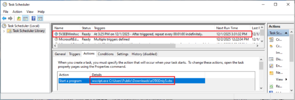 .NETモジュールはTaskServiceオブジェクトを作成してそのメソッドを呼び出し、トリガー条件、実行アクション、および反復間隔を設定します。その後、taskService.RootFolder.RegisterTaskDefinition()メソッドを呼び出して新たにスケジュールされたタスクを登録します。図10では作成されたスケジュールタスクを示しています。