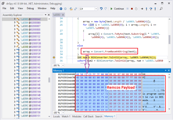 .NETモジュールは当該ファイルをダウンロードしてメモリ内に保持します。このファイルにはRemcosエージェントのペイロードが格納されており、ペイロードは2段階で難読化されています(Base64エンコードした後、エンコードされた文字列を逆転させます)。図11の下部に、メモリ内のBase64デコードされたRemcosペイロードが表示されています。