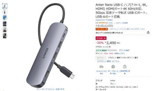 AnkerのUSB-Cハブ「Anker Nano USB-C ハブ(7-in-1,4K,HDMI)」が、Amazonのタイムセール対象になっています。参考価格4,990円のところ、30%オフの3,490円で販売中です。