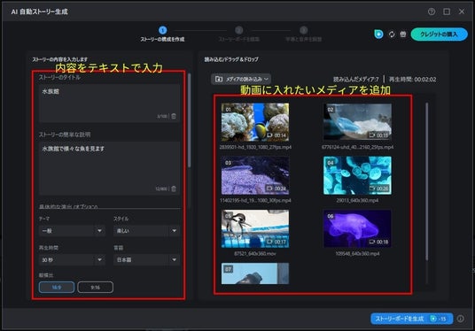 ※AI 自動ストーリー機能の使用にはクレジットが必要となります。基本消費 10 クレジットに加え、読み込んだメディア 1 分ごとに 5 クレジットが消費されます。