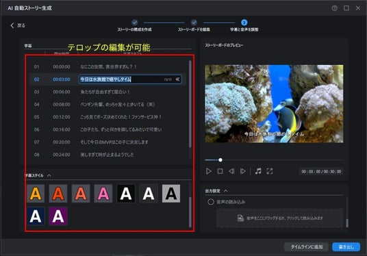 自動生成されたテロップは後から自由に編集できるほか、さらに細かな調整を行いたい場合には、タイムラインに追加して編集を続けることも可能です。