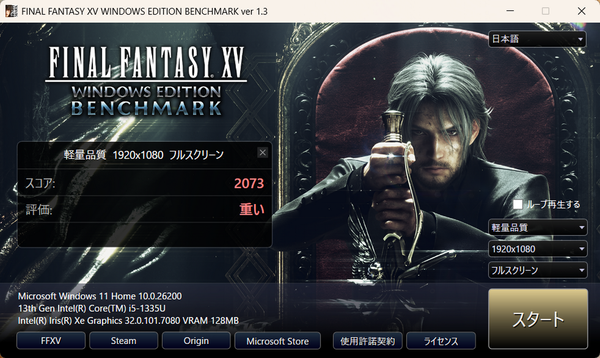 また、「ファイナルファンタジーXIV:暁月のフィナーレベンチマーク」(1920×1080ドット、標準品質、ノートPC)のスコアは4396(普通)、 「FINAL FANTASY XV WINDOWS EDITION BENCHMARK ver 1.3」(軽量品質、1920×1080ドット、フルスクリーン)のスコアは2073(重い)となった。
