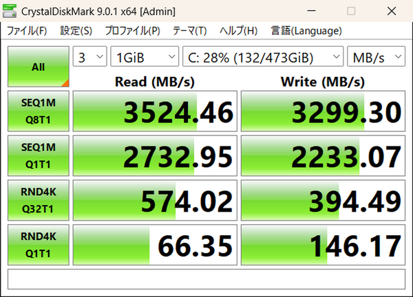 ストレージは「WD PC SN740 SDDQNQD-512G-1016」を搭載しており、「CrystalDiskMark 9」のシーケンシャルリード(SEQ1M Q8T1)は3524MB/s、シーケンシャルライト(SEQ1M Q8T1)は3299MB/sとなった。