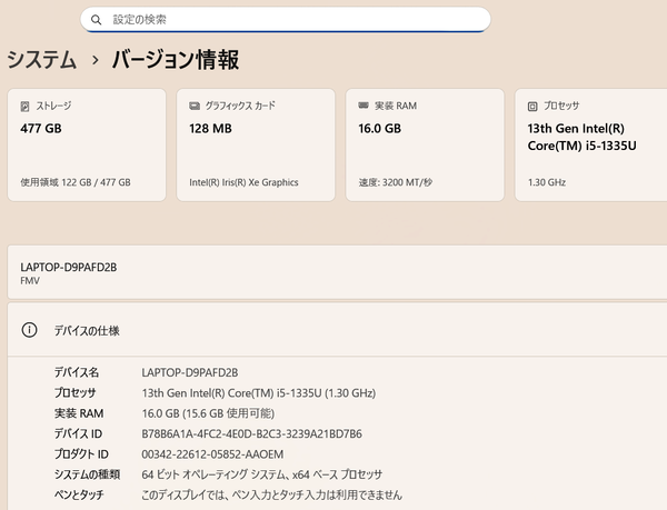 今回試用している「FMV WE1-K3」が積む「Core i5-1335U」のiGPU(内蔵GPU)は「Intel Iris Xe Graphics eligible」だ。そして本製品のメモリーは16GB(8GB×2)のデュアルチャネル構成なので、Intel Iris Xe Graphicsの性能を最大限に引き出せる。ただし、プレイできるゲームは、「ファイナルファンタジーXIV」クラスが上限と考えたほうがよいだろう。