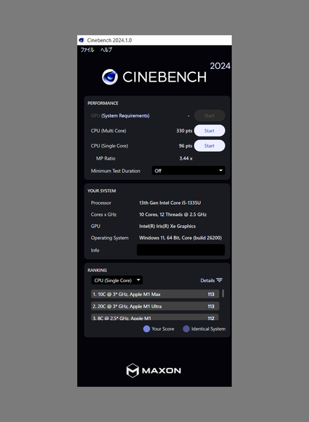 今回の試用機は、「Core i5-1335U」(10コア[2P+8E]、12スレッド、最大4.6GHz、15W)、メモリー16GB、ストレージ512GB(PCIe Gen3 x4接続)というスペックだ。ベンチマークはバッテリーベンチを除き、最大パフォーマンスを発揮する設定で実施している。