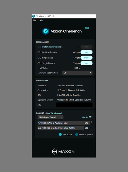 まず「FMV WE1-K3」のCPU性能については、「CINEBENCH 2024」のCPU(Multi Core)は330pts、CPU(Single Core)は96pts、「CINEBENCH 2026」のCPU(Multi Threads)は1403pts、CPU(Single Core)は470pts、CPU(Single Threads)は390ptsとなった。