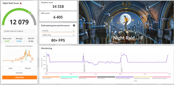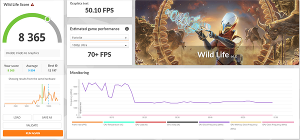 つぎに3Dグラフィックス性能については、「3DMark」のTime Spyは1266、Fire Strikeは3248、Wild Lifeは8365、Night Raidは12079だった。
