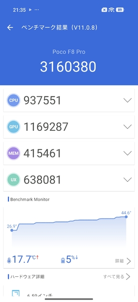 さらに素晴らしいのが「冷却性能」です。どんなに良いCPUを積んでいても、熱くなると自動で性能が落ちる仕組みになっています。これはゲーミングPCと同じです。しかし、POCO F8 Proは強力な独自の冷却システムを装備しているため、長時間ゲームをしていても本体が熱くなりにくく、カクつきがほとんど起きません。