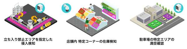 新たに拡張された「バウンディングボックスアクション」は、カメラで撮影した映像の分析対象を多角形で指定可能にする。これにより、AIでの分析精度が向上し、現場環境を変更することなく、効率的にAI活用を進めることが可能になるという。例えば、製造現場では立ち入り禁止エリアの侵入検知、また販売現場では惣菜コーナーの在庫状況の確認などに活用できる。