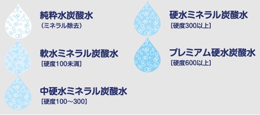 5種類の炭酸水(純粋炭酸水、軟水ミネラル炭酸水、中硬水ミネラル炭酸水、硬水ミネラル炭酸水、プレミアム硬水ミネラル炭酸水)を提供。5種類全てRO膜で濾過して純粋水にした後にミネラルを添加し、炭酸ガスを注入することで、一般的なペットボトルの炭酸水では高価格帯になりがちな高品質の強炭酸水を低価格で提供します。