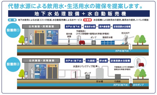 今後の展開として、日常では地下水使用による水道コストの削減・水自動販売機による水サービス提供として活躍し、災害時では井戸水などの地下水を利用することで、水自販機による飲用水や雑用水の提供、トイレの開放を実現。日常で使える自販機が災害時に水道が断水した状況でも飲料水の供給拠点になり、防災インフラとしての役割を担います。