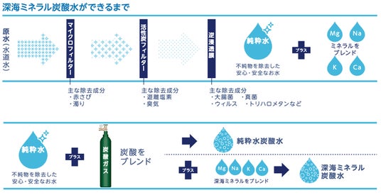当社のコア技術であるRO膜(逆浸透膜)により水道水を一度純粋水にし、そこへ源泉した深海ミネラルや強炭酸を加えることで、品質・味・機能性を高いレベルで実現。