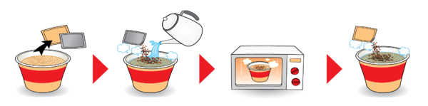 3.フタをすべてはがし、粉末スープ①と②を入れ、よく混ぜてから食べる
