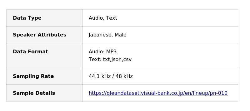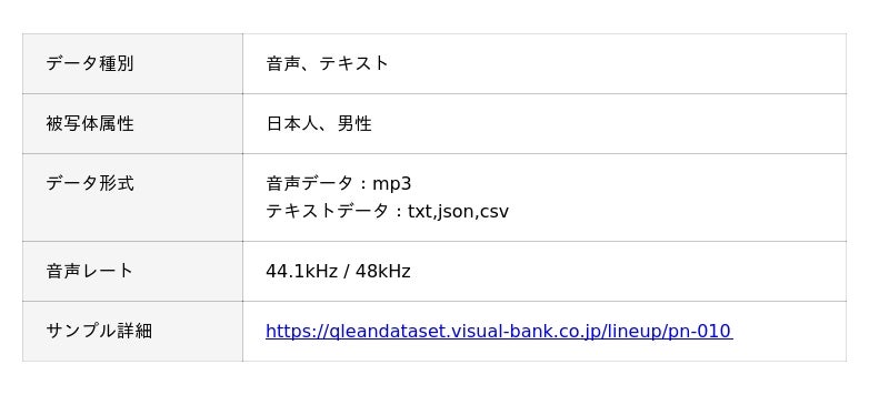 Qlean Datasetでは、研究用途から商用利用を前提としたAI開発までを見据え、権利処理や利用条件を整理したデータ提供を行っています。本データセットもその一環として、日本語音声と言語情報の対応関係を扱うAI開発・検証環境の整備を目的に提供されます。