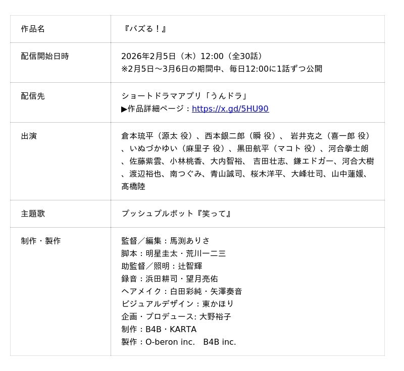 縦型ショートドラマの企画・制作を手がける株式会社B4B(ビーフォービー、本社:東京都千代田区、代表取締役:大野 康介、以下B4B)によるオリジナルショートドラマ『バズる!』が、ショートドラマアプリ「うんドラ」にて、2026年2月5日(木)12:00 より独占配信されます(2月5日~3月6日の期間中、毎日12:00に1話ずつ公開)。