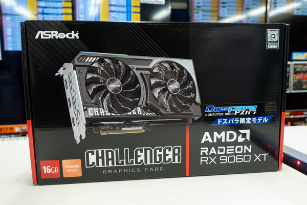 ビデオカードは、Radeon RX 9060 XTを搭載したASRock「Radeon RX 9060 XT Challenger 16GB ドスパラ限定モデル」になる。通常モデルとの違いはGPUコアクロック。ドスパラ限定モデルは定格クロックで、オーバークロックはされていない。