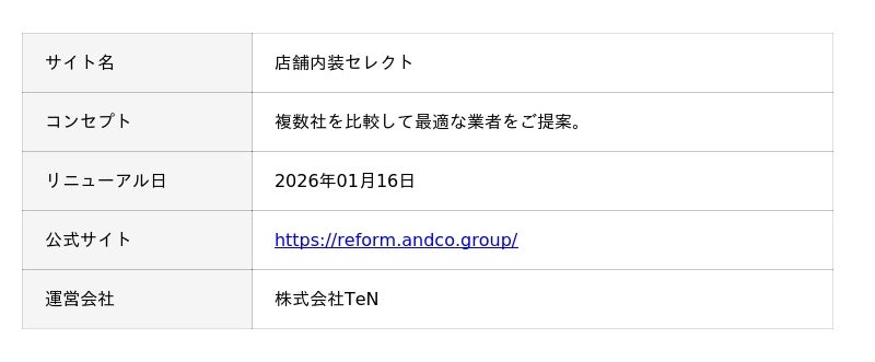 Webマーケティング事業やWeb広告事業を手掛ける株式会社TeN(代表取締役社長:廣瀬由典/本社:東京都渋谷区)は、飲食店やサロン・アパレルなど店舗内装に関する最適な業者を提案し、見積もりを比較できるサイト『店舗内装セレクト(https://reform.andco.group/)』のサイトデザインを一新し、サービスの本格運用を開始いたしました。