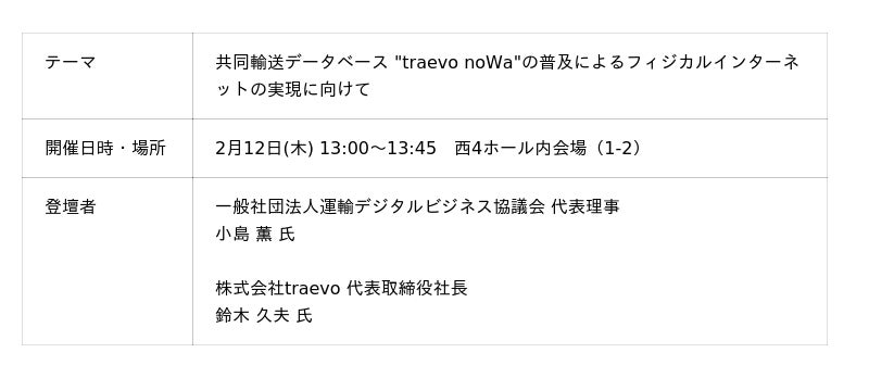 本展示会では、一般社団法人運輸デジタルビジネス協議会(本社:東京都港区、代表理事:小島 薫、以下「TDBC」)との共催出展を行います。当社製品の『ロジックス』に加え、動態管理プラットフォーム『traevo Platform』および共同輸配送デジタルマッチングサービス『traevo noWa』を体験いただけるブースを展開します。