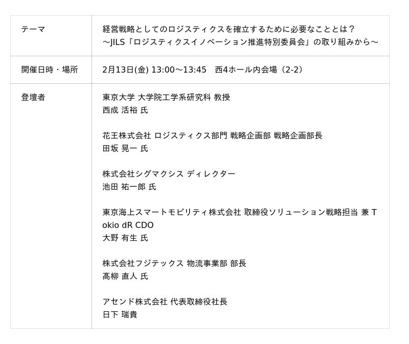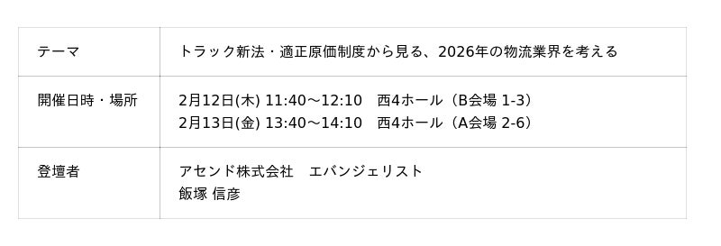 合わせて、プレゼンテーションセミナーおよびロジスティクスカンファレンスにも登壇します。法改正への対応や制度の背景にある意図を紐解きながら、物流業界が直面する構造的課題を捉え直し、意思決定につながる視点を提供いたします。