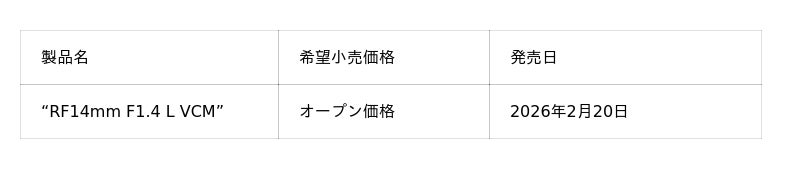 キヤノンは、「EOS R SYSTEM」の交換レンズ「RFレンズ」の新製品として、画面全域での高画質と開放F値1.4による大きく美しいボケ味を生かした撮影ができるF1.4 L VCMシリーズの大口径超広角単焦点レンズ”RF14mm F1.4 L VCM”を2026年2月20日に発売します。