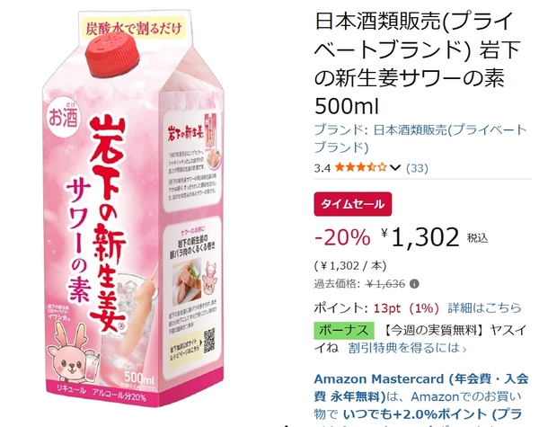 「岩下の新生姜サワーの素 500ml」は、現在開催中のAmazonタイムセールで20%オフとなっています。