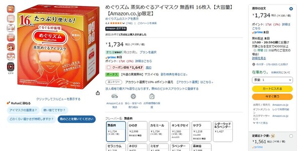 Amazon.co.jpにて、めぐりズムの「蒸気めぐるアイマスク 無香料 16枚入」が販売中だ。価格は1734円。