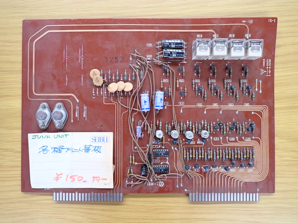 メールには写真も添付されていた。「CPUは載っていませんが、手元にある別のジャンク基板も、部品配置から用途が謎でしたが、エレメカ系アーケードゲームだった可能性があります。(中略)この基板の入手先は、伝説の“アスターインターナショナル”です。1975年頃に西武池袋店で開催されたマイコンイベントのジャンク基板即売会で売れ残った品です」との説明だ。吉崎氏は、売れ残った基板を50年間も保管していたことになる。さすが。