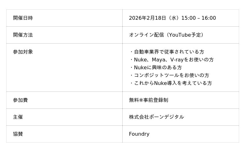 株式会社ボーンデジタル(本社:東京都千代田区、CEO:新 和也、URL:https://www.borndigital.co.jp/ )は、Nukeを活用した自動車のコンポジット事例をご紹介するオンラインセミナー「Nuke Meetup Online 2026|実例から学ぶ! Maya × Nukeによる実践的なフォトリアル・コンポジット手法 ~日本デザインセンター事例~」を、2026年2月18日(水)に開催いたします。