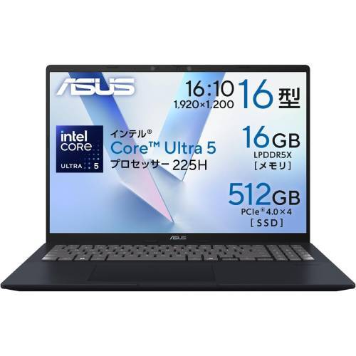 CPUはインテル Core Ultra 5 225Hを搭載。メモリ16GB(オンボード)、SSDはPCIe 4.0接続の512GB。NPU(Intel AI Boost)対応。