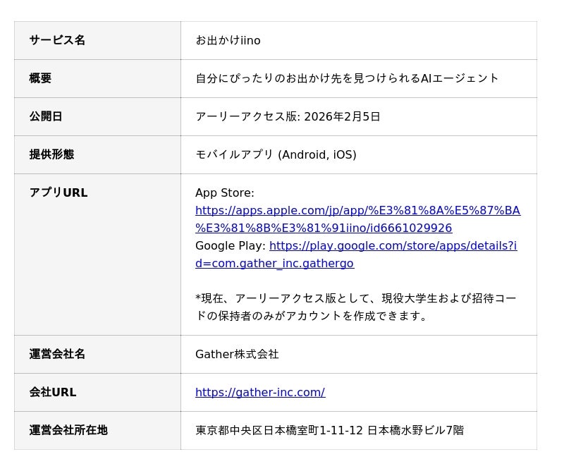 Gather株式会社(本社:東京都中央区、代表取締役:高比良 悠)は、AIを活用して「自分に本当に合うお出かけ先」を提案するお出かけAIエージェント『お出かけiino(イイノ)』のアーリーアクセス版を、2026年2月5日より公開いたします。