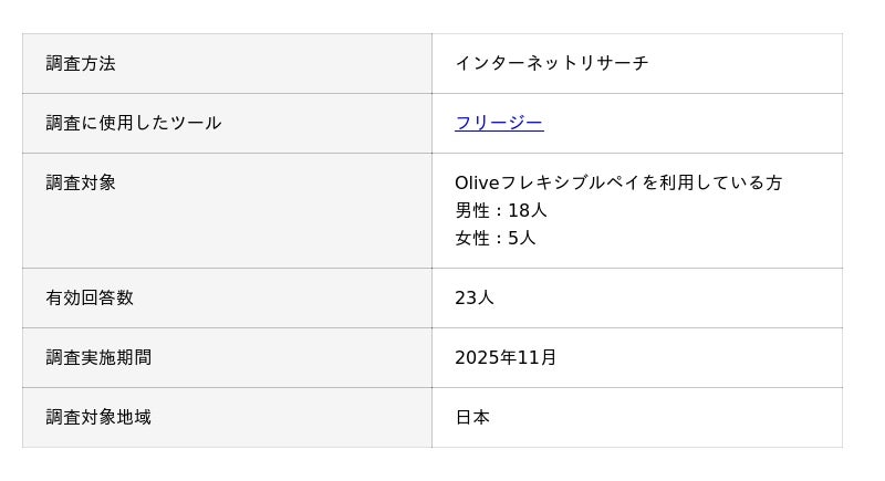 ココモーラでは、ユーザーの生の声を調査するため「Oliveフレキシブルペイに関するアンケート調査」を行いました。アンケート調査の概要は以下の通りです。