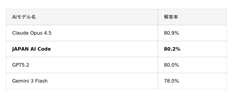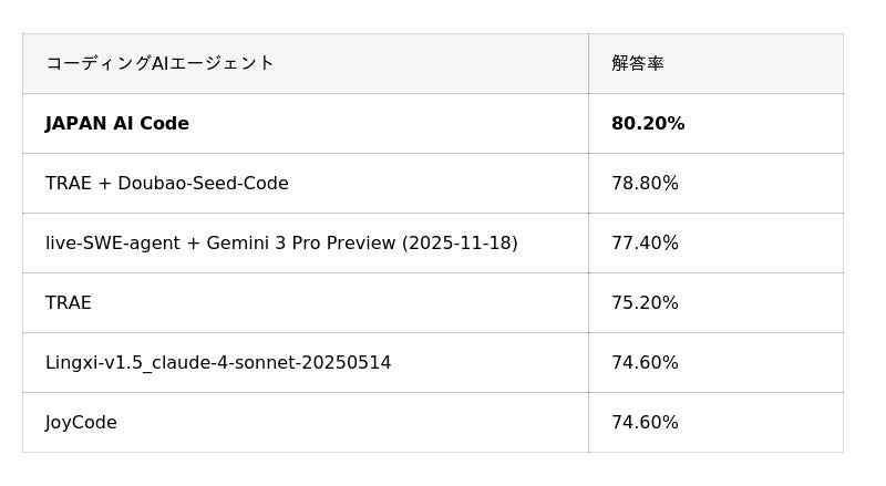 JAPAN AI株式会社(本社:東京都新宿区、代表取締役社長:工藤 智昭、以下JAPAN AI)は、AIコーディングエージェント「JAPAN AI Code」が、ソフトウェア開発AIの国際的な評価基準であるSWE-bench Verifiedベンチマークにおいて、全500問の評価で解決率80.2%を達成したことを発表します。これは、国内で独自開発されたAIエージェント基盤として世界最高水準の結果です。