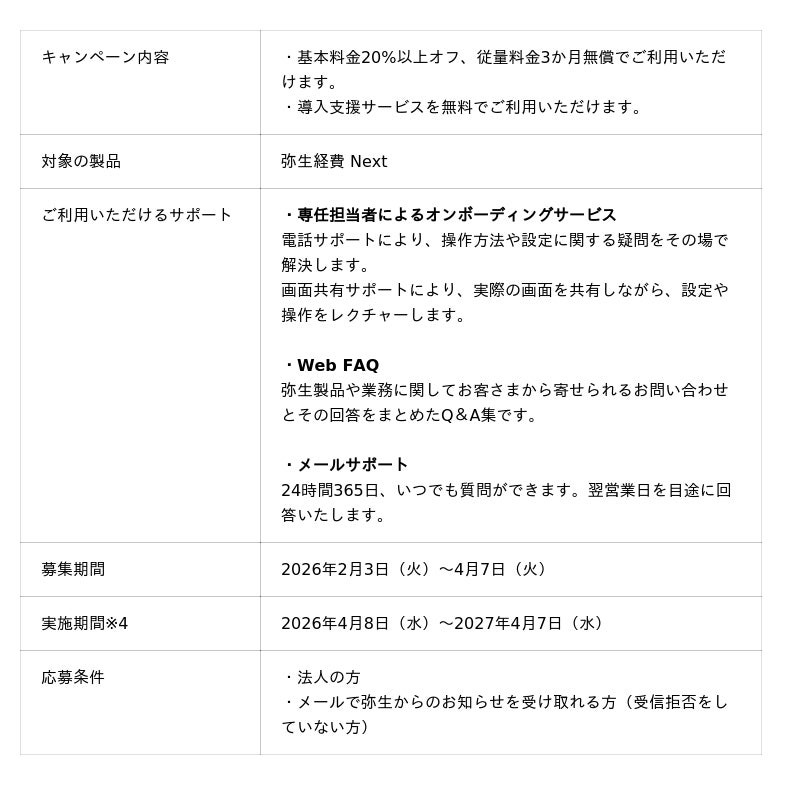 弥生株式会社(本社:東京都千代田区、代表取締役 社長執行役員 兼 CEO:武藤健一郎、以下「弥生」)は、2026年2月3日より、クラウド経費精算ソフト「弥生経費 Next」の単体販売における事前登録受付を開始したことをお知らせします。これまで、「弥生経費 Next」は法人向けクラウドサービス「弥生会計 Next」 とあわせて提供してきました。今回、単体でご利用いただける販売を開始することで、経費業務のみを導入したいお客さまにも柔軟にお選びいただけるようになります。 また、事前申し込みキャンペーンとして、期間中に申し込んでいただくことで基本料金が20%オフ、従量料金が3か月無償と、低コストで経費精算の効率化をすることができます。「弥生経費 Next」は2026年4月8日に単体での販売を開始する予定です。