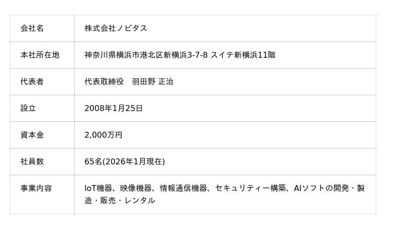 ノビタスは、ネットワークカメラやモバイルネットワーク、AIソフトや画像処理などの情報通信機器をお客様の課題に合わせて最適なIoTソリューションとして提案・提供しています。創業以来「現場主義」をモットーに、官民問わず様々な業種のお客様からの厳しい要望に応えてきました。当社は今後もIoT技術と人の持つ力を結集し、お客様一人ひとりの課題解決を目指す" オプティマゼーション(お客様の「声」の最適化)・カンパニー"として、社会全体の安心と安全を守り、より良い未来を創造するために、日々進化を続けていきます。