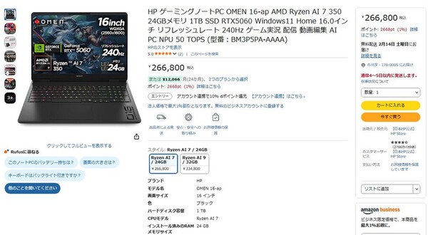 Amazon.co.jpにて、HPの16型ゲーミングノートPC「OMEN 16-ap」が販売中だ。価格は26万6800円。
