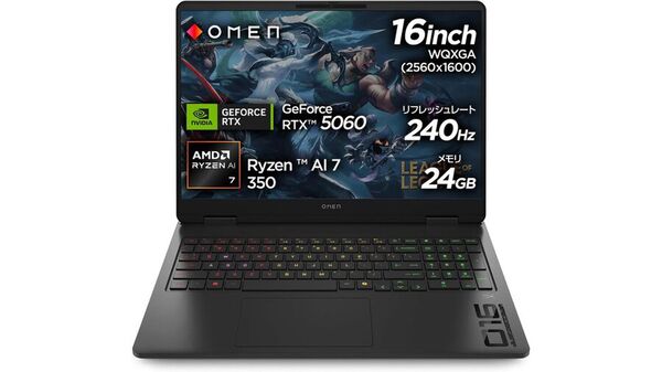 OMEN 16-apは、AMD「Ryzen AI 7 350」とNVIDIA「GeForce RTX 5060 Laptop(VRAM 8GB)」を搭載する16型ゲーミングノートPCだ。解像度は2560×1600ドット、リフレッシュレートは240Hz、メモリーは24GB(DDR5)、ストレージは1TB SSD。