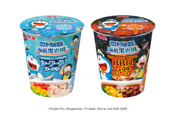 明星食品は「明星 映画ドラえもん 新・のび太の海底鬼岩城 シーフード味ヌードル」と「(同) BBQしょうゆ味ヌードル」を2月23日に全国で発売する。