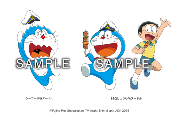 パッケージデザインには、ドラえもんやのび太くんなどが登場。それぞれのフレーバーに合わせて、「シーフード味ヌードル」では海中を、「BBQしょうゆ味ヌードル」では海底でバーベキューを楽しむドラえもんたちの様子が描かれている。
