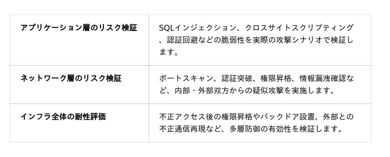 当社では、お客様のセキュリティ課題を解決するための総合的なセキュリティサービスを提供しています。その中のひとつであるペネトレーションテストは、Webアプリケーションにとどまらず、ネットワーク機器や通信経路を含むインフラ層までを対象とすることで、システム全体を網羅的に検証できるサービスであり、下表のようなテストをお客様に提供しています。これらのテストにより、アプリケーションからネットワーク・インフラまで一貫してセキュリティリスクを洗い出し、実運用に即したセキュリティリスクを把握することができ、お客様のセキュリティ課題の解決に貢献します。