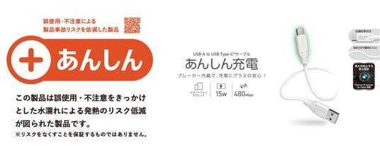この度の表彰で、USBケーブルのコネクターに内蔵された温度ブレーカーが発熱を検知すると通電を遮断し、発熱のリスクを低減できることが第三者機関によって証明されました。さらに今後、当製品には「誤使用・不注意をきっかけとした水濡れによる発熱のリスク低減が図られた製品」と表示することが認められました。