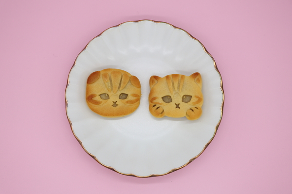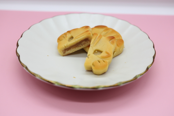 2種類のにゃんこのかわいい顔をかたどったおまんじゅうで、中身の餡はキャラメル味でした。