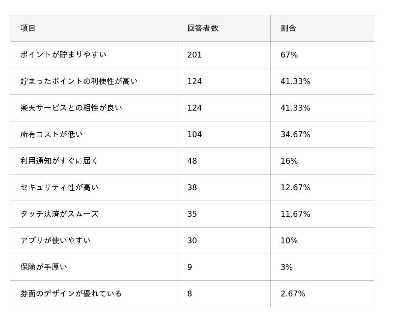 - 楽天カードを利用して感じた良い点TOP3は「ポイントが貯まりやすい」「貯まったポイントの利便性が高い」「楽天サービスとの相性が良い」。