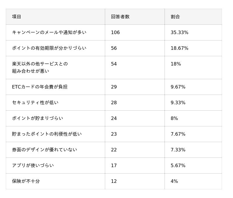 - 反対に、楽天カードを利用して感じた不満点TOP3は「キャンペーンのメールや通知が多い」「ポイントの有効期限が分かりづらい」「楽天以外の他サービスとの組み合わせが悪い」。