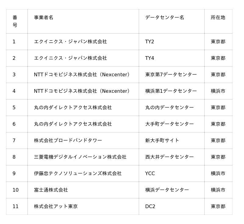接続実績のある主要なデータセンター 2026年1月時点 ※順不同