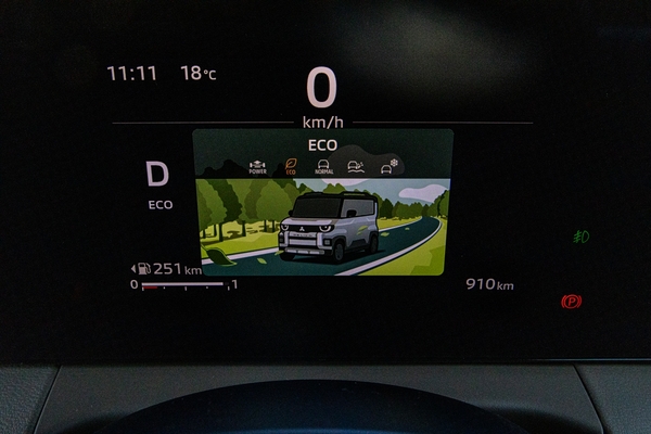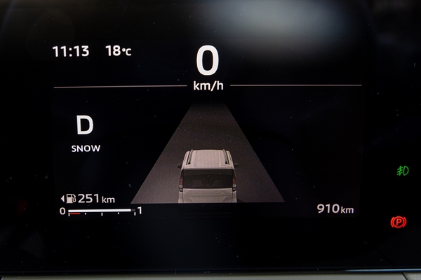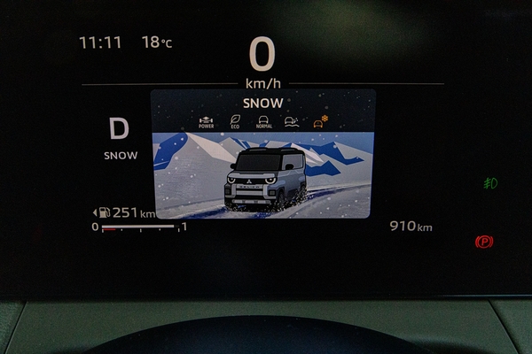 見慣れないのは銀色のダイヤル。これは何かというとドライブモードセレクターで、「ノーマル」「エコ」「パワー」「グラベル」「スノー」の全5種類。エンジンレスポンスとシフトマップ、スタビリティーコントロール、トラクションコントロールのレスポンス、ブレーキLSDのレスポンス、電動パワーステアリングの6つのパラメーターが変わり、それぞれの道に対応するとのこと。ちなみに、兄弟車である新型eKスペースは「ノーマル/エコ/パワー」の3種類。ダイヤルでチェンジするあたりが、三菱らしいところでしょう。